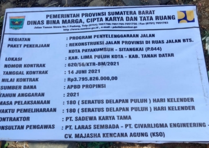 Seperti halnya Pekerjaan Rekonstruksi perbaikan jalan Provinsi Sumatra Barat yang berlokasi di ruas Kota Payakumbuh – Setangkai di daerah Kabupaten Lima Puluh Kota – Tanah Datar, tepatnya di jorong Pakan Raba’a Nagari Batu Payuang.