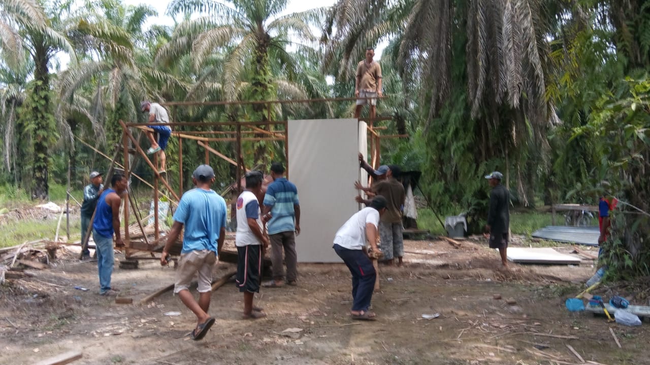 NKRIPOST.CO | Rohil – Dengan penuh semangat Masyarakat Dusun Pematang Muawam RT 027 RW 010 Kepenghuluan Ujung Tanjung Kec. Tanah Putih Kabupaten Rokan Hilir bersama ketua RT bergotong royong membedah Rumah seorang Kakek Hidup Sebatang Kara Minggu 26 September 2021