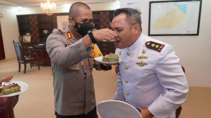 NKRI Post, Asahan – Kapolres Asahan AKBP Putu Yudha Prawira SIK MH bersama Forkopimda Asahan memberikan surprise/kejutan dengan menyambangi Danlanal Tanjung Balai Asahan dengan membawa Tumpeng dan Kue Ulang Tahun dalam rangka Hari ulang tahun TNI ke -76 tahun, Selasa(05/10/2021)Siang.
