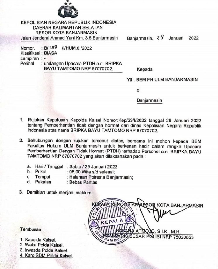 NKRI POST, Banjarmasin – Tak sekedar menebar janji, Kapolresta Banjarmasin Kombes Pol Sabana A Martosumito memastikan upacara Pemberhentian Tidak Dengan Hormat (PTDH) terhadap Bripka Bayu Tamtomo, polisi di satuan Narkoba yang memperkosa mahasiswi ULM digelar pada Sabtu (29/1) pagi sekira pukul 08.00 wita di halaman Mapolresta Banjarmasin.