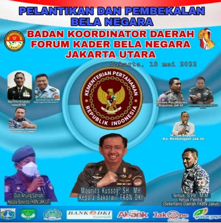 NKRIPOST, JAKARTA – Memasifkan Pembinaan kesadaran Bela Negara kepada masyarakat. Badan Koordinasi Daerah Forum Kader Bela Negara (Bakorda FKBN) Jakarta Utara yang merupakan organisasi dibawah Pembinaan Kementerian Pertahanan RI melaksanakan Pelantikan pengurus dan Pembekalan Bela Negara. Kegiatan ini diselenggarakan di Gedung Balai Yos Sudarso Lt.3 Walikota Jakarta Utara pada hari Rabu, (18/05/2022).