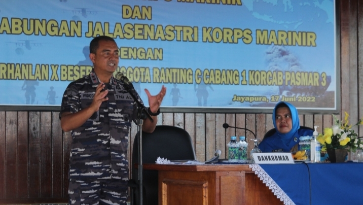 NKRIPOST, JAYAPURA – Komandan Batalyon Marinir Pertahanan Pangkalan (Danyonmarhanlan) X Jayapura Letkol Marinir Agung Prasetyo, M.Tr. Opsla menerima kunjungan kerja Komandan Korps Marinir (Dankormar) Mayjen TNI (Mar) Widodo Dwi Purwanto yang didampingi Ketua Gabungan Jalasenastri Korps Marinir, Ny. Wid Widodo Dwi Purwanto bertempat di Mako Yonmarhanlan X Jayapura, Jl. Amphibi No.1 Kelurahan Hamadi, Distrik Jayapura Selatan, Kota Jayapura, Papua. Jum’at (17/06/2022).