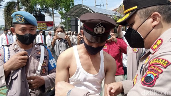 Tampak dalam upacara pemberhentian dengan tidak hormat, polisi berpangkat Aipda AL ini dicopot baju dinasnya oleh Kapolres Purworejo, AKBP Muhammad Purbaja dan diganti dengan kemeja batik.