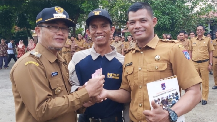 NKRIPOST PAYAKUMBUH — Baru saja usai Upacara Hari Bakti PU ke 77, Penjabat Wali Kota Payakumbuh Rida Ananda memanggil 2 orang pegawai Dinas PUPR, ASN dan TJP yang sedang dalam barisan maju ke depan, Senin (5/12).