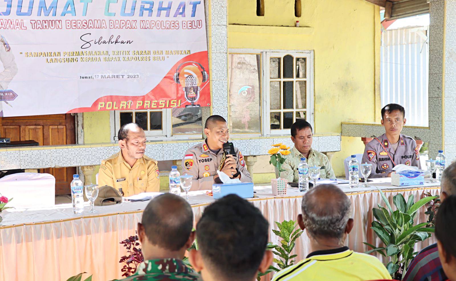 “Untuk bapak ibu ketahui, Kegiatan jumat curhat ini merupakan program bapak Kapolri yang tujuannya untuk mendekatkan Polri dengan masyarakat serta menampung aspirasi dari masyarakat. Ini tidak saja dilaksanakan di Polres tapi juga dilaksanakan oleh 7 polsek jajaran, tentunya dengan lokasi dan masyarakat yang berbeda”ungkap Kapolres Belu.