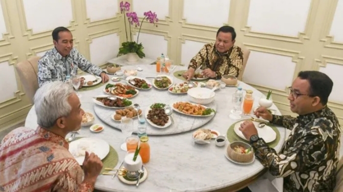 Di ruang makan Istana Merdeka, Jakarta, Jokowi bersama ketiga bakal capres itu duduk mengelilingi meja makan bundar.