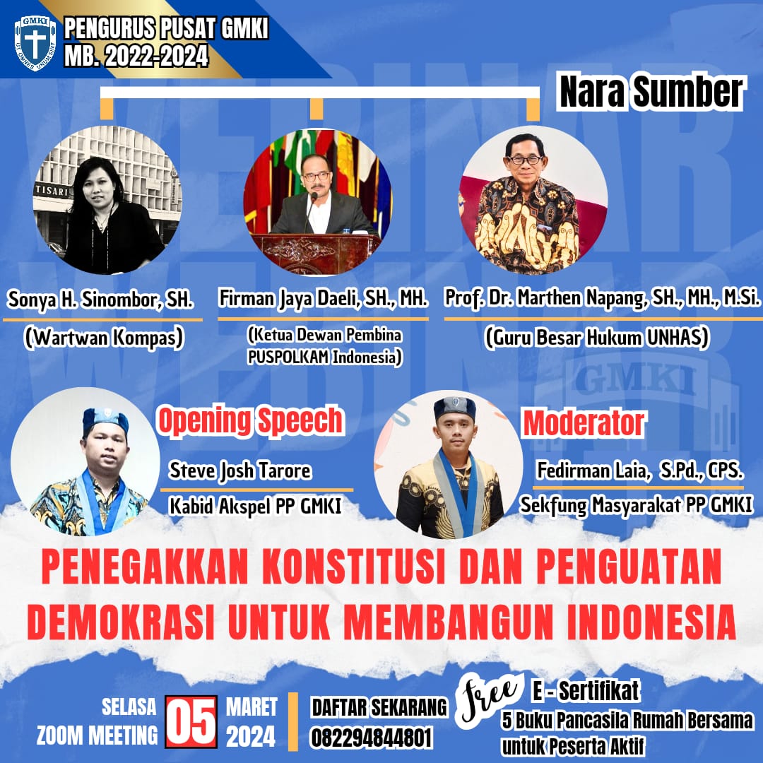 Webinar yang digelar kali ini, GMKI Mengusung tema “Penegakan Konstitusi dan Penguatan Demokrasi untuk Membangun Indonesia”, Weminar ini ingin menyampaikan pesan akan pentingnya kesadaran rakyat dalam menentukan masa depan Bangsa Indonesia melalui pemilihan umum yang Jurdil dan Luber.