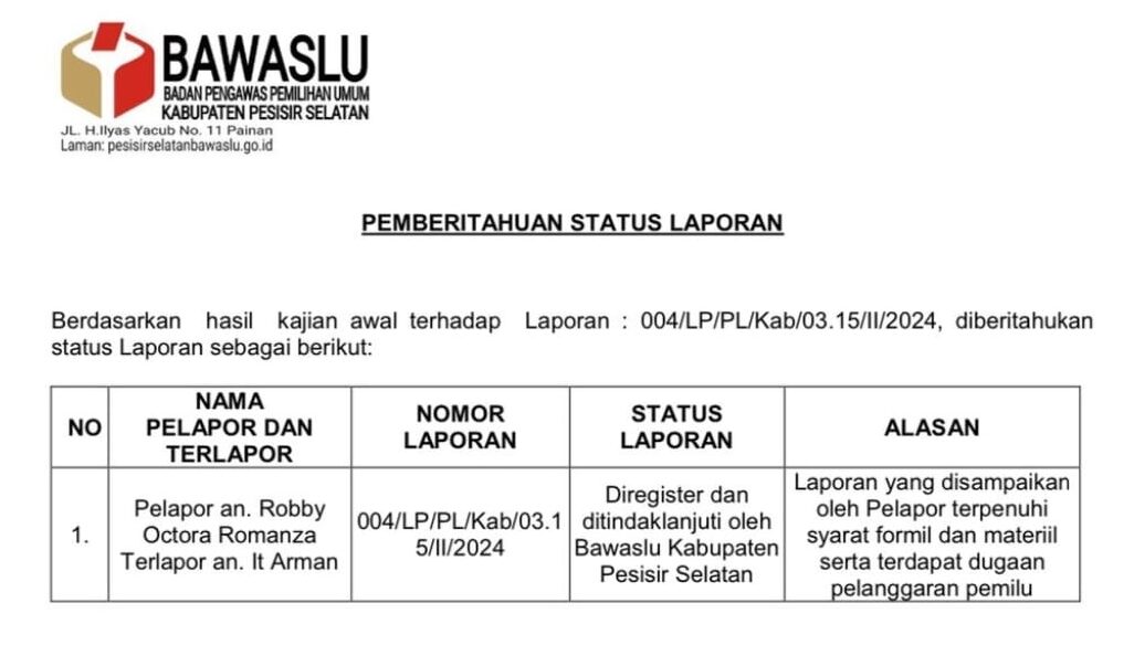 “Berdasarkan hasil kajian awal terhadap laporan: 004/LP/PL/Kab/03.15/II/2024, diberitahukan status laporan diregister dan ditindaklanjuti oleh Bawaslu Kabupaten Pesisir Selatan dengan alasan laporan yang disampaikan oleh pelapor terpenuhi syarat formil dan materil, serta terdapat dugaan pelanggaran pemilu.”